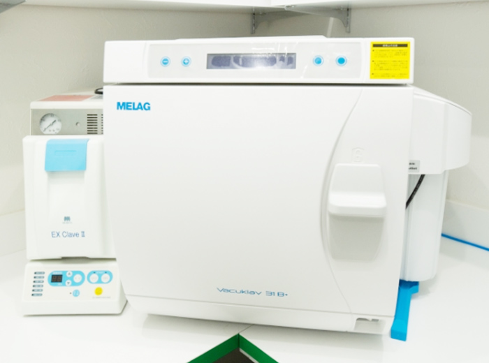 口腔外バキュームや滅菌精度が最も高い装置などの機器を完備。感染物質を徹底的に排除することで治療時の口内感染を防いでいます。